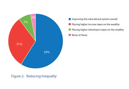 Additionally, an overwhelming majority— 59 percent— think improving the overall educational system is the first step in battling economic inequality. Only 31 percent prefer a tax on the high income people, and a mere 7 percent believe an inheritance tax as a way to fight inequality.